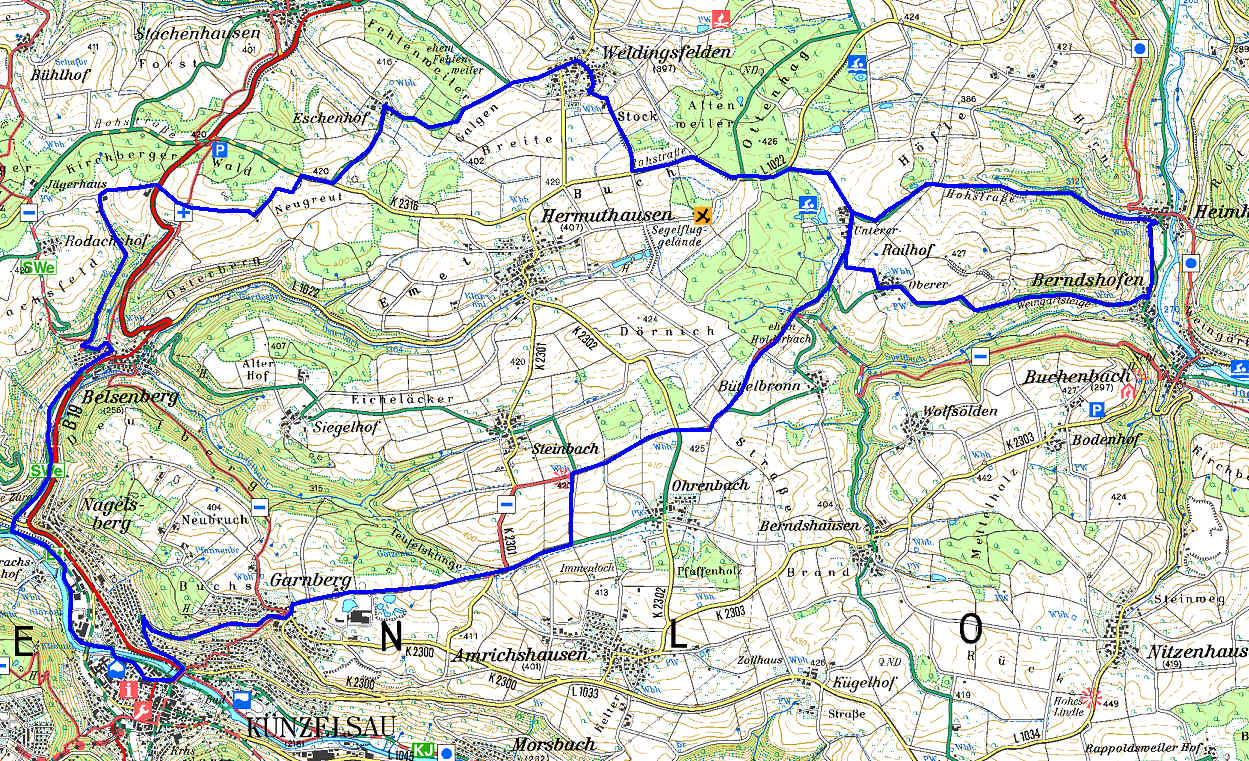 Kün - Criesbach - Sattel - Halberg - Crispenhofen - Diebach - Hohe Straße - Hermuthausen - Ohrenbach - Garnberg - Kün (Hopfenlocher) |